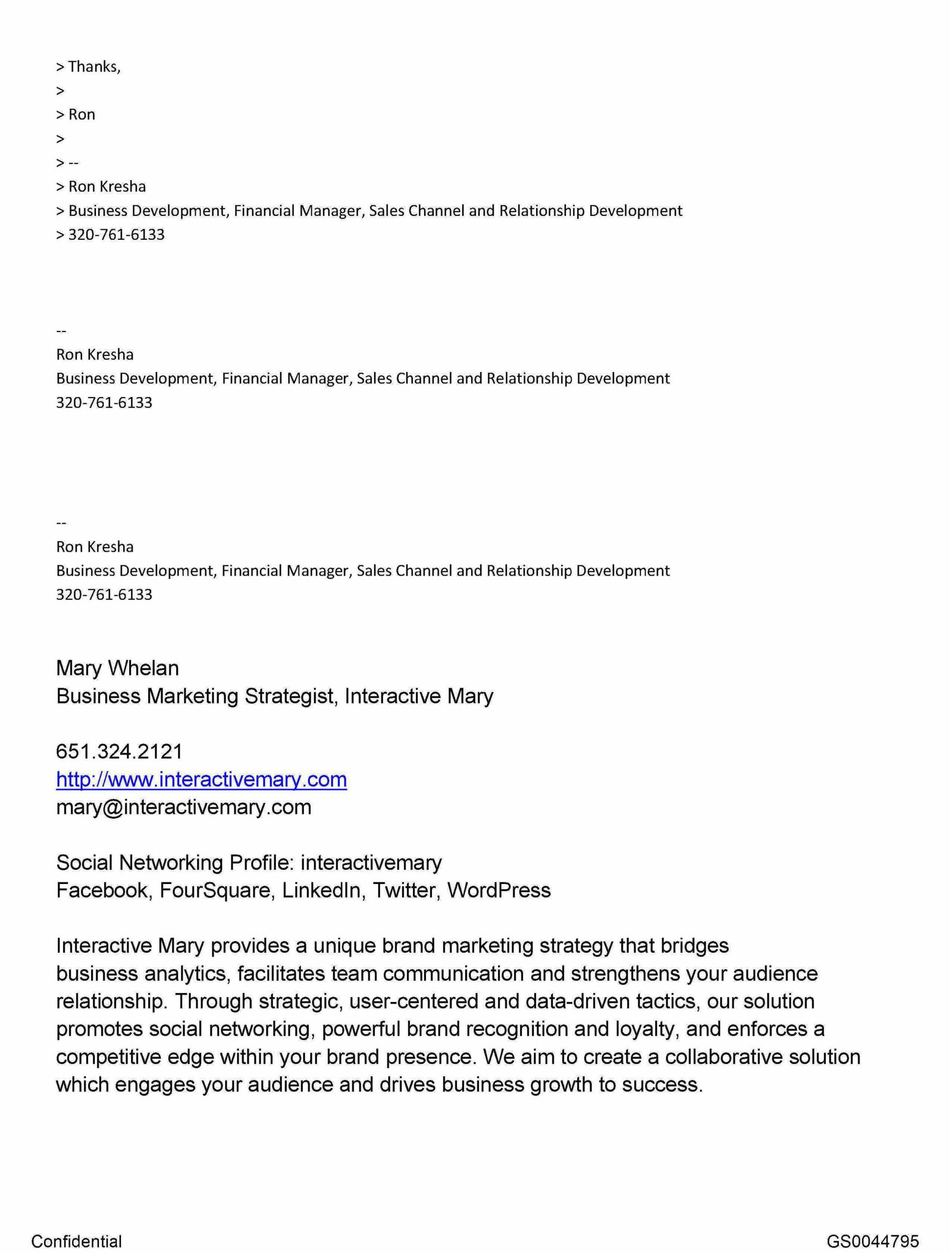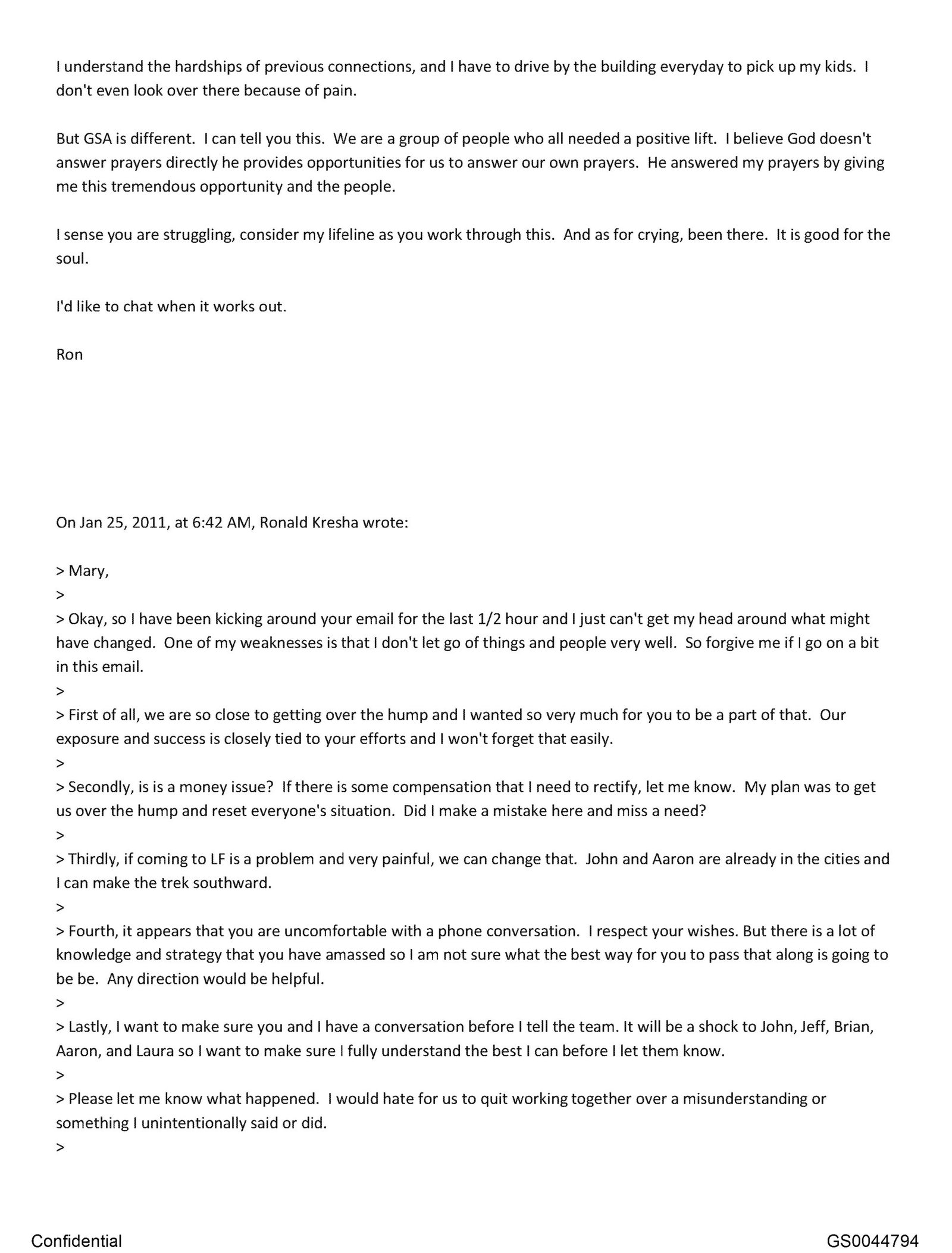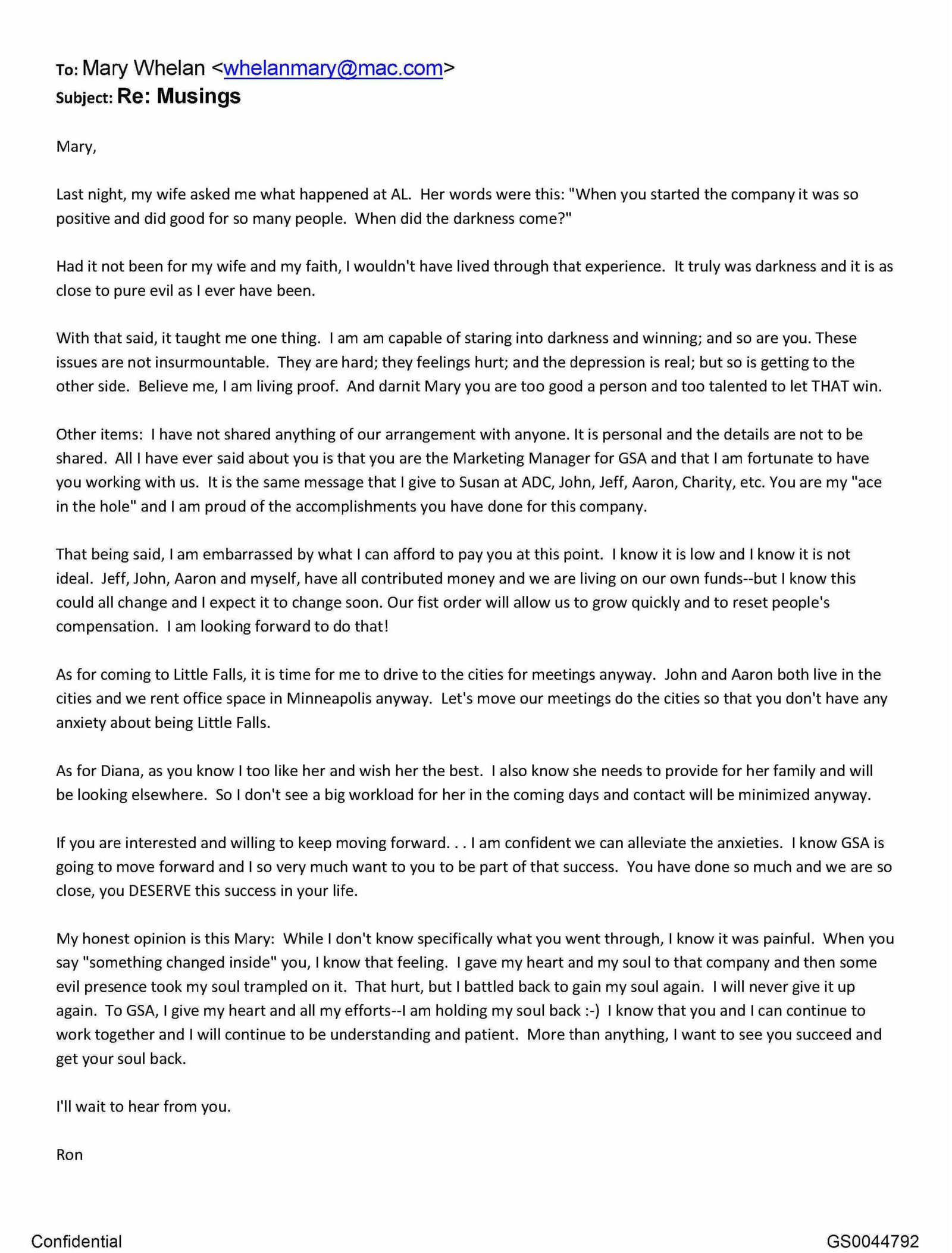 The emails show Ron Kresha attempting to persuade marketing strategist Mary Whelan to continue working with his struggling company (GSA).