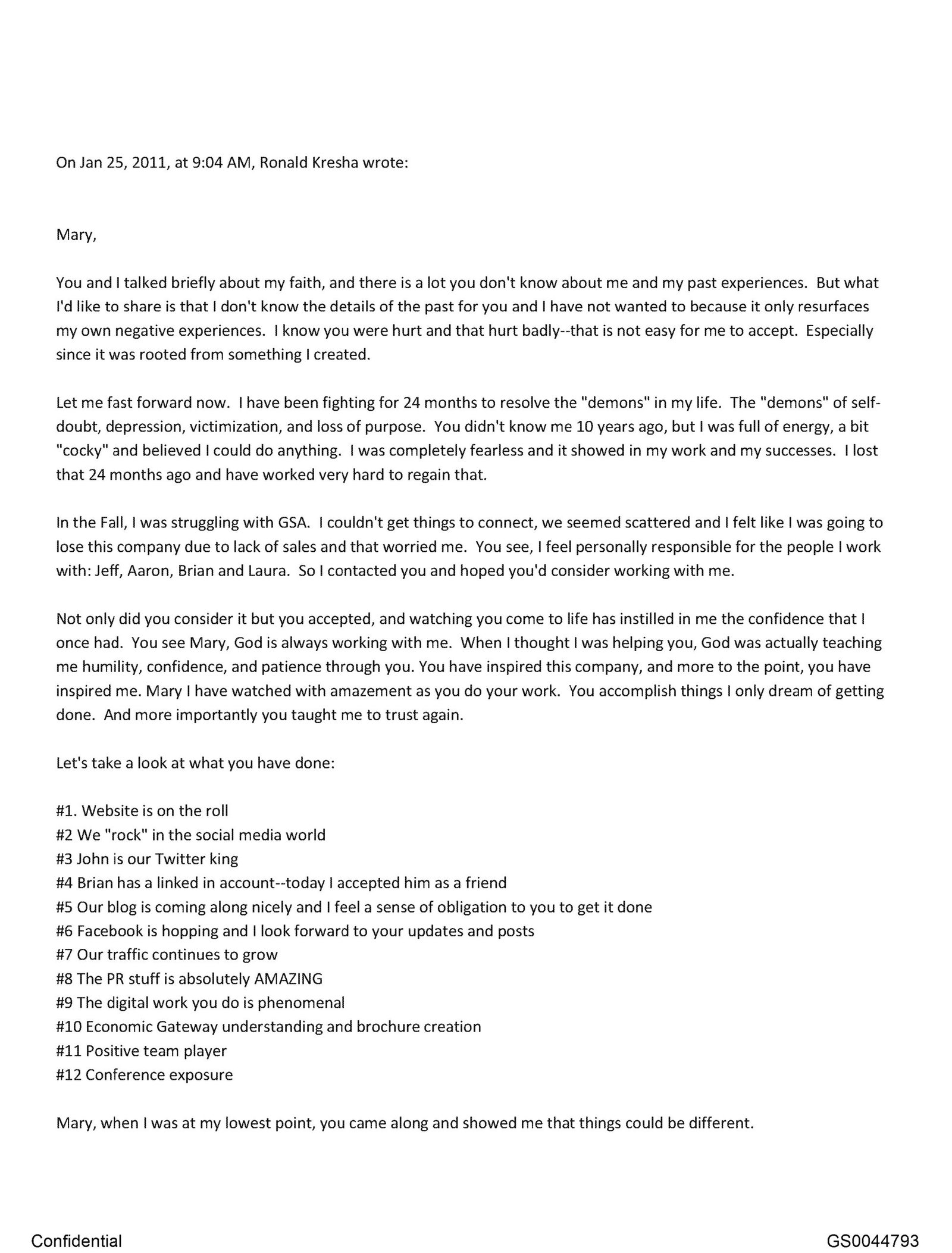 Mary Whelan was instrumental in Golden Shovel Agency cementing that first big sale, but then Ron Kresha withheld the payments and promises he had made to her. Email dated February 4, 2011 from Ron Kresha to Golden Shovel Agency staff praising a major contract win, crediting Mary Whelan for marketing efforts that advanced the company’s success, and discussing leveraging the deal for future growth.